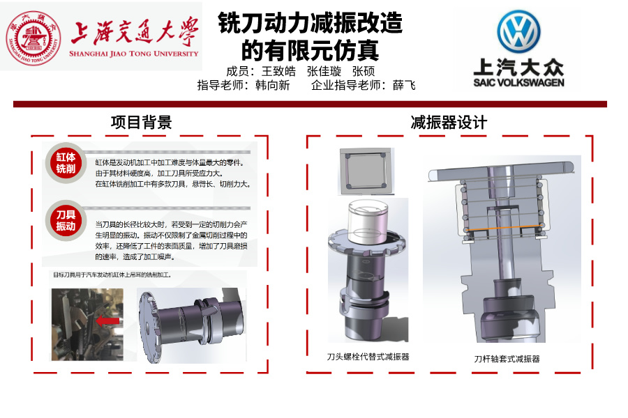 缸體是發(fā)動(dòng)機(jī)加工中加工難度與體量最大的零件,材料硬度高,加工刀具所受應(yīng)力大,在缸體銑削加工中有多款刀具,懸臂長(zhǎng)、切削力大,當(dāng)?shù)毒叩拈L(zhǎng)徑比較大時(shí),若受到一定的切削力會(huì)產(chǎn)生明顯的振動(dòng)。振動(dòng)不僅限制了金屬切削過程中的效率,還降低了工件的表面質(zhì)量,增加了刀具磨損的速率,造成了加工噪聲。因此,金屬切削過程中避免和抑制振動(dòng)非常重要,這也是大眾公司設(shè)立課題進(jìn)行研究的目的。為降低振動(dòng)對(duì)銑削加工的影響,本課題通過設(shè)計(jì)加裝在銑刀上的動(dòng)力減振裝置,改善銑刀加工過程中的動(dòng)力結(jié)構(gòu),從而實(shí)現(xiàn)系統(tǒng)性有效減振。項(xiàng)目首先通過Ansys和Abaqus兩種軟件進(jìn)行有限元仿真,設(shè)計(jì)適應(yīng)安裝在刀桿上的動(dòng)力減振器。通過對(duì)比選擇最佳的減振器設(shè)計(jì)方案加工出實(shí)體模型進(jìn)行性能測(cè)試。預(yù)期實(shí)現(xiàn)減小切削振動(dòng)最優(yōu)效果,降低噪音,提升刀具壽命,降低生產(chǎn)成本。