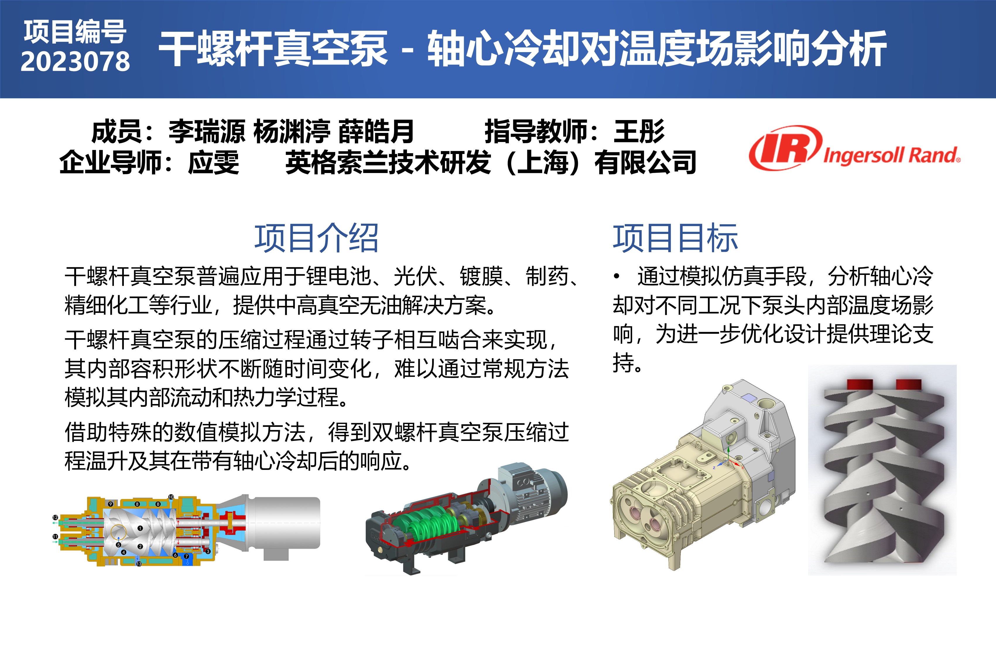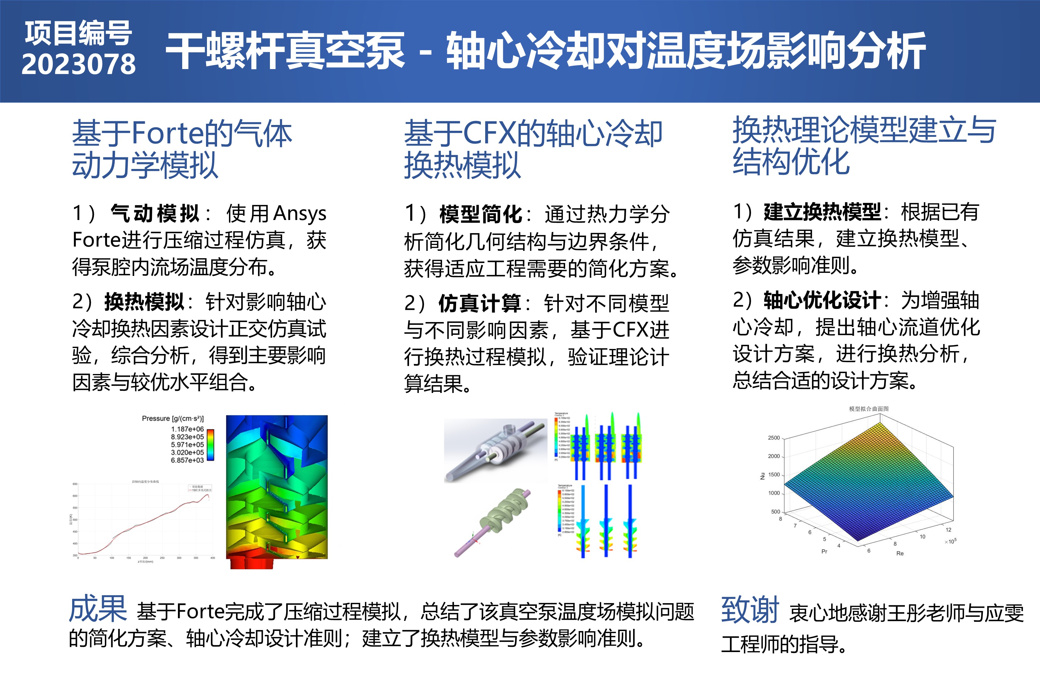 本項(xiàng)目主要使用CFX和Forte兩種CFD軟件對英格索蘭提供的干式螺桿真空泵泵頭內(nèi)部溫度場細(xì)部的變化情況進(jìn)行數(shù)值研究,分別通過對壓縮過程和換熱過程的仿真,得到流動(dòng)與溫度的變化特性,并通過改變相應(yīng)參數(shù)(冷卻介質(zhì)種類,入口溫度、流量,軸心管徑等)觀察分析對冷卻效果的影響。同時(shí)對該模型進(jìn)行了理論上的換熱分析,并基于仿真結(jié)果建立了干式螺桿真空泵軸心冷卻方案的設(shè)計(jì)指導(dǎo)準(zhǔn)則以及新的換熱模型,并基于理論對軸心流道進(jìn)行了優(yōu)化設(shè)計(jì)。