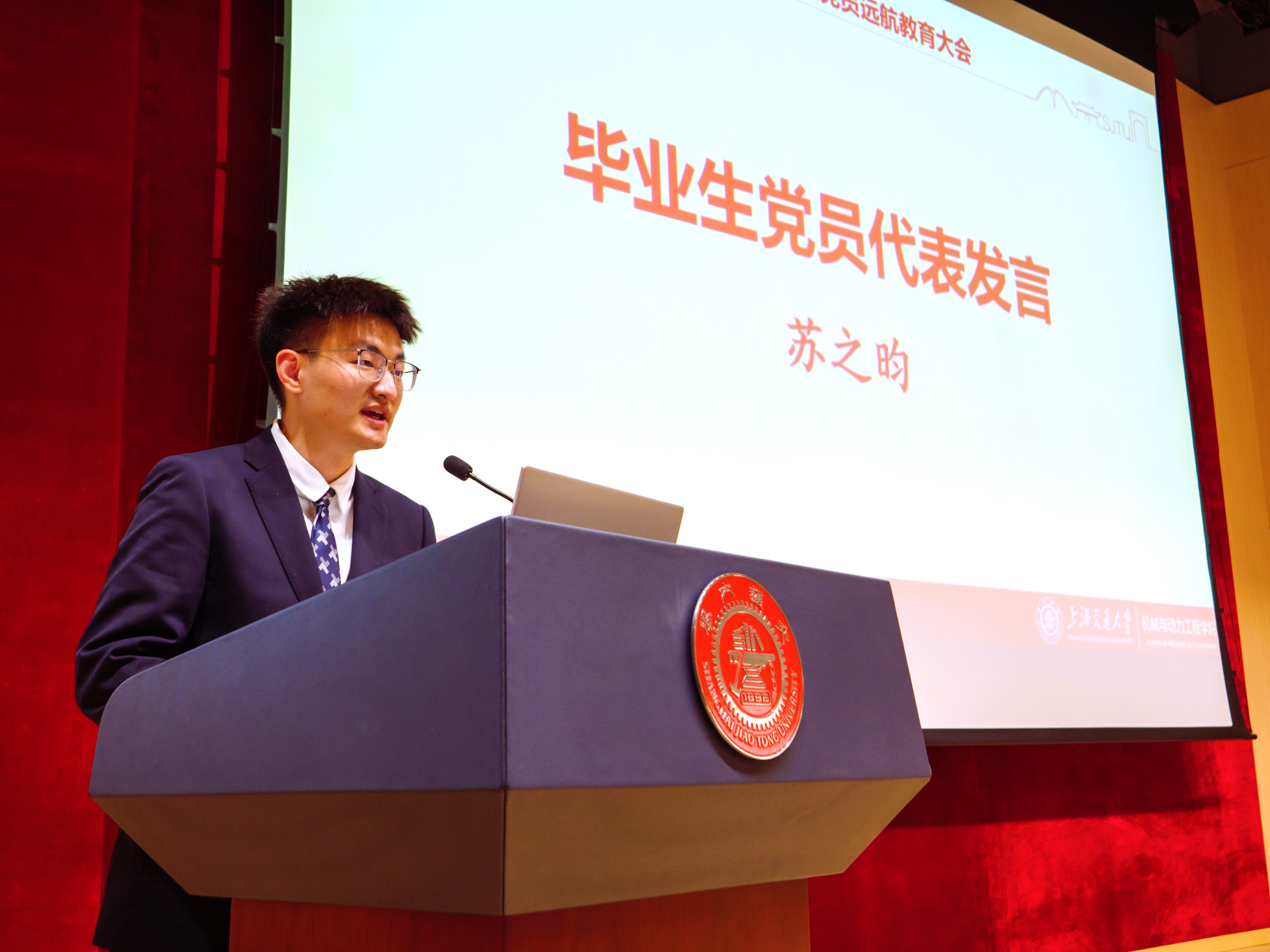 蘇之昀作為畢業(yè)生黨員代表,表達(dá)了對(duì)母院悉心培養(yǎng)的感恩之情。他結(jié)合自身學(xué)習(xí)科研經(jīng)歷,號(hào)召大家多干實(shí)事、增長(zhǎng)才干,不懼挑戰(zhàn)、頑強(qiáng)拼搏,志存高遠(yuǎn)、敢為人先,傳承“飲水思源,愛國(guó)榮校”的校訓(xùn),讓青春在奮斗中閃耀光芒,用實(shí)際行動(dòng)書寫人生華章。