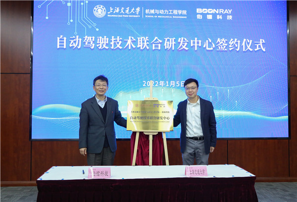 1月5日,校友企業(yè)上海伯鐳智能科技有限公司和上海交通大學(xué)機(jī)械與動(dòng)力工程學(xué)院舉行自動(dòng)駕駛技術(shù)聯(lián)合研發(fā)中心簽約揭牌儀式。機(jī)械與動(dòng)力工程學(xué)院院長杜朝輝、副院長朱磊,伯鐳科技創(chuàng)始人兼CEO、校友胡心怡,聯(lián)合創(chuàng)始人兼CTO、校友楊揚(yáng)等參加了儀式。