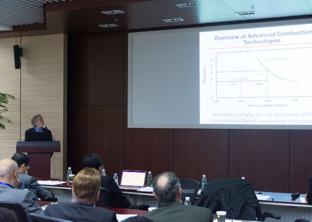 簽約儀式結(jié)束后,與會專家學(xué)者參加了由上海交通大學(xué)機械與動力工程學(xué)院和中國內(nèi)燃機學(xué)會后處理技術(shù)分會共同舉辦的“先進燃燒技術(shù)與顆粒物(PM/PN)控制國際研討會”,探討機動車先進燃燒技術(shù)和機動車國六排放法規(guī)實施相關(guān)的先進后處理技術(shù)。黃震、Ronald Matthews、Rasto Brezny、Imad Khalek、環(huán)保部機動車排污監(jiān)控中心王燕軍、德克薩斯大學(xué)奧斯汀分校Matthew Hall、上海市環(huán)境科學(xué)研究院黃成、廈門環(huán)境保護機動車污染控制技術(shù)中心蘇盛8位專家學(xué)者圍繞新燃料和先進燃燒技術(shù)、美國和中國柴油機改造技術(shù)、PM/PN測試技術(shù)和傳感器技術(shù)、柴油機加裝DPF治理等方面的技術(shù)和方案等做特邀報告。