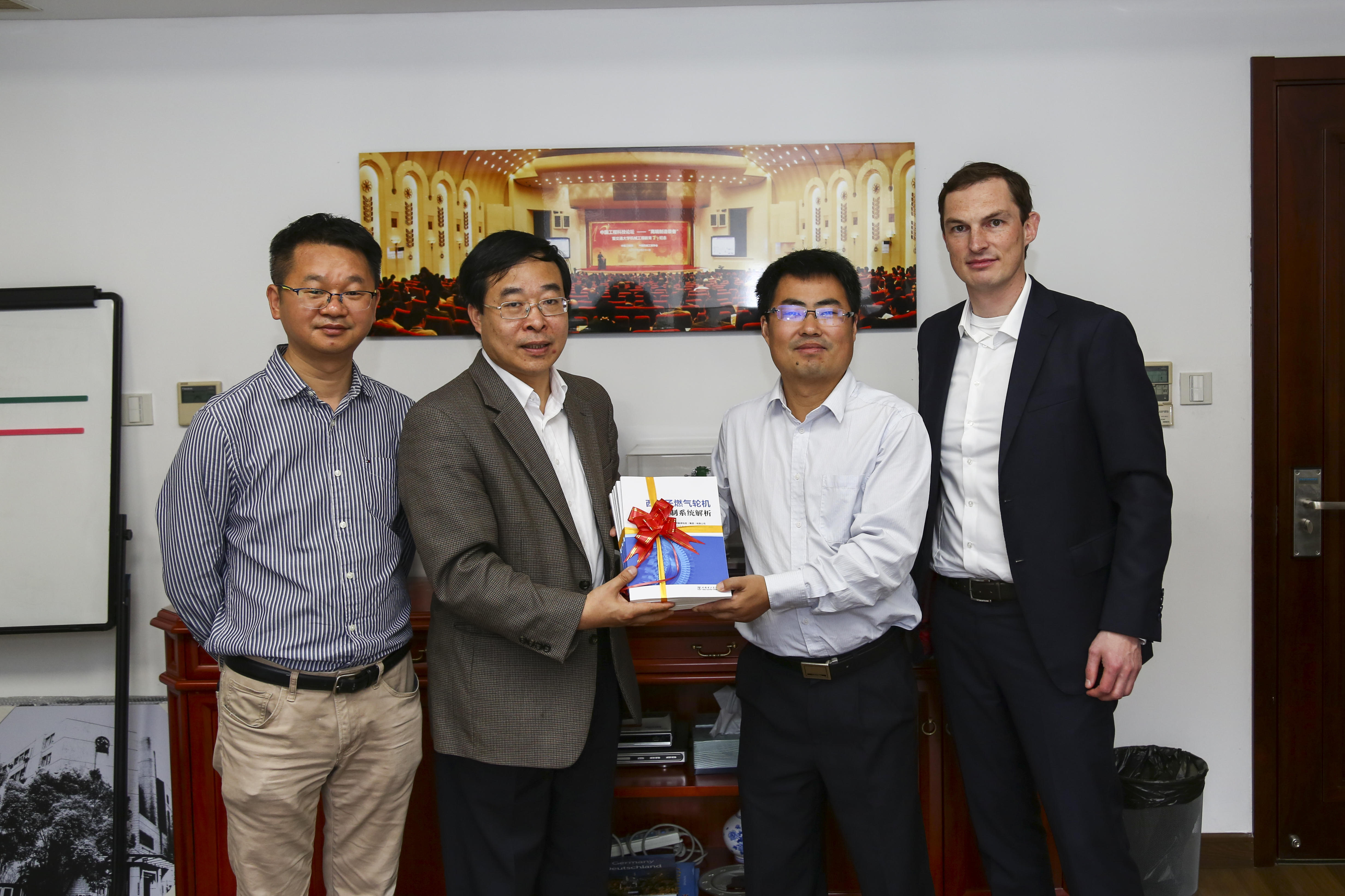 學(xué)院教師彭迪、夏唐斌作為聯(lián)合培養(yǎng)博士生導(dǎo)師與周業(yè)濤、Neuenhahn共同在合作協(xié)議上簽字。周業(yè)濤代表西門子公司向?qū)W院捐贈近百本燃機(jī)領(lǐng)域的書籍。