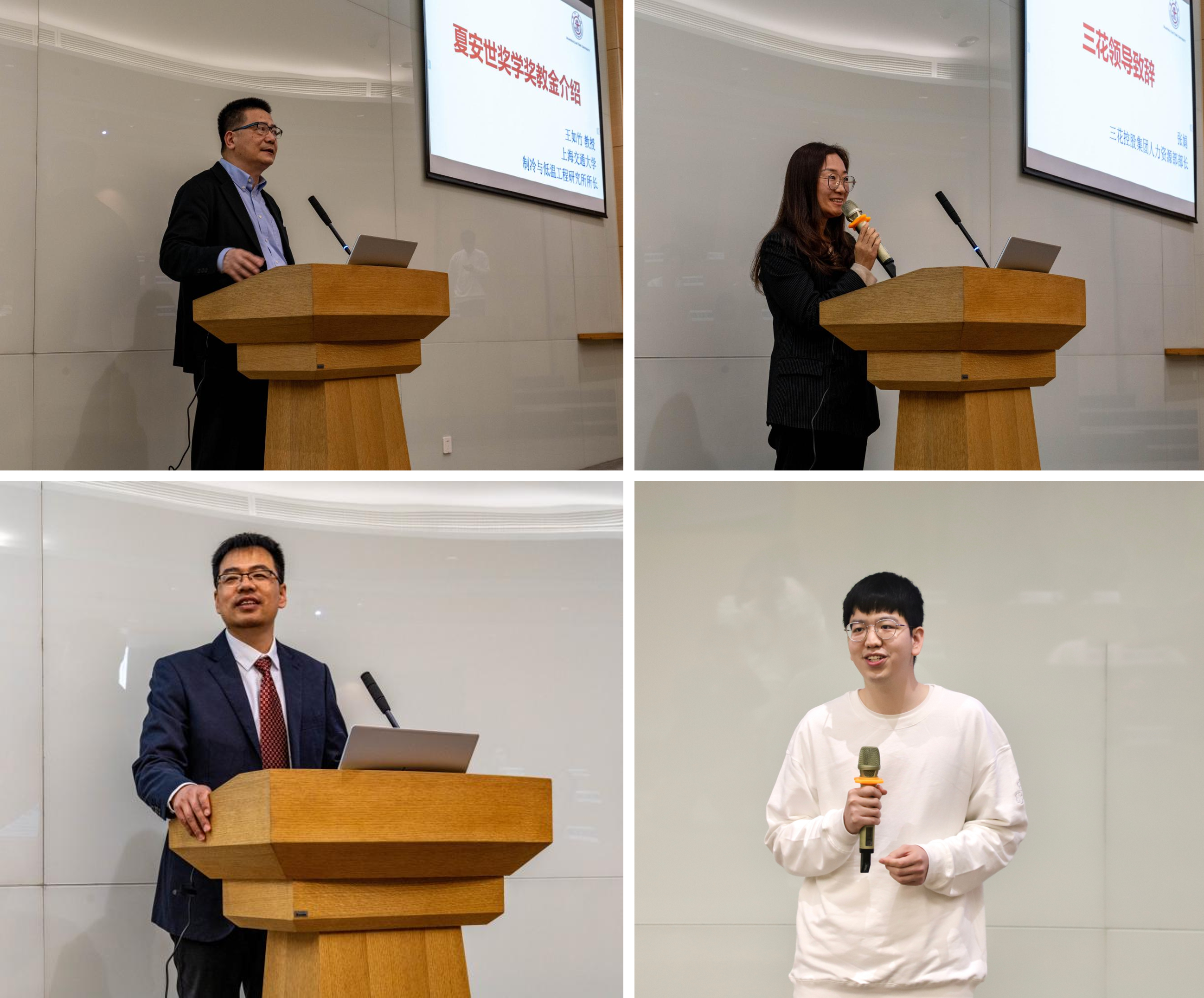 典禮上,王如竹介紹了夏安世獎學(xué)獎教金創(chuàng)立及發(fā)展的歷程,張娟代表三花公司致辭并介紹了三花的發(fā)展,李廷賢做了題為“高密度熱能存儲及能質(zhì)調(diào)控的探索與思考”的報告,山訸代表學(xué)生發(fā)表獲獎感言。