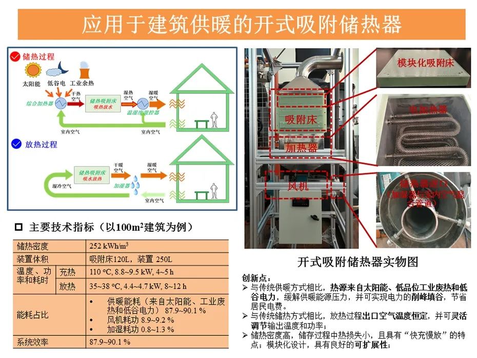為了幫助推進北方“煤改電”清潔供暖政策,基于吸附劑與水蒸氣間的解吸-吸附循環(huán),設計了一種開式吸附儲熱器。可以有效存儲太陽能、低品位工業(yè)廢熱和低谷電力,具有溫濕度調(diào)節(jié)功能,能夠在儲熱階段和放熱階段無間歇供暖,提供30-35oC的濕潤暖風,實現(xiàn)了舒適性供暖。該儲熱器供暖溫度、供暖功率和供暖量可靈活調(diào)節(jié),并且采用了模塊化設計,具有良好的可擴展性。儲熱密度高達252kWh/m3, 系統(tǒng)效率可達到87.9~90.1%。對于北京地區(qū)的一套面積100m2,供暖需求44W/m2的典型住宅,若采用低谷電作為供熱熱源,相比空氣源熱泵等電采暖器,每日可節(jié)約居民電費21.1元。