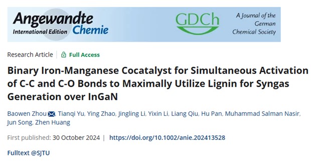 近日,新能源動(dòng)力研究所黃震院士團(tuán)隊(duì)周寶文副教授在Angew. Chem. Int. Edit.上發(fā)表了題為“Binary Iron-Manganese Cocatalyst for Simultaneous Activation of C-C and C-O Bonds to Maximally Utilize Lignin for Syngas Generation over InGaN”的研究論文。該研究通過(guò)InGaN納米線/Si組裝體擔(dān)載的Fe-Mn二元非金屬催化劑,同時(shí)活化木質(zhì)素豐富的C-C和C-O鍵,實(shí)現(xiàn)太陽(yáng)光驅(qū)動(dòng)木質(zhì)素和水高效轉(zhuǎn)化制綠色合成氣,光→燃料的能量效率達(dá)到11.8%。新能源動(dòng)力研究所2021級(jí)碩士生俞天奇、加拿大麥吉爾大學(xué)博士生Ying Zhao為論文第一作者,周寶文副教授、加拿大麥吉爾大學(xué)Jun Song教授為共同通訊作者。