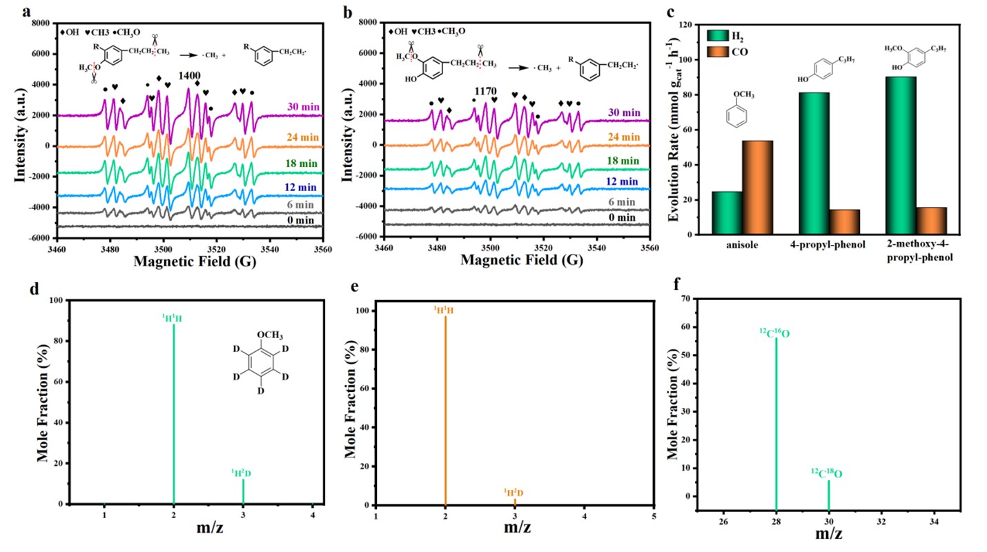 Fe-Mn納米顆粒修飾的InGaN納米線/Si組裝體在太陽(yáng)光子的激發(fā)下,利用半導(dǎo)體組裝體產(chǎn)生的光生空穴有效活化斷裂木質(zhì)素分子中的OCH3的C-O鍵和CH2CH2-CH3的C-C鍵,釋放出•CH3,隨之與水分解產(chǎn)生的•OH自由基經(jīng)過(guò)系列演變最后生成CO和H2。同位素標(biāo)記、原位譜學(xué)表征以及理論計(jì)算揭示了木質(zhì)素和水分子演變成合成氣的反應(yīng)路徑(圖2)。研究發(fā)現(xiàn),合成氣主要來(lái)源于木質(zhì)素衍生的•CH3和水氧化產(chǎn)生的•OH。模型化合物活性以及C-C鍵和C-O鍵斷裂能大小的比較,進(jìn)一步證實(shí)Fe-Mn二元助催化劑可同時(shí)斷裂木質(zhì)素的C-C和C-O鍵,使最大化利用木質(zhì)素不同官能團(tuán)制備綠色合成氣成為可能。
