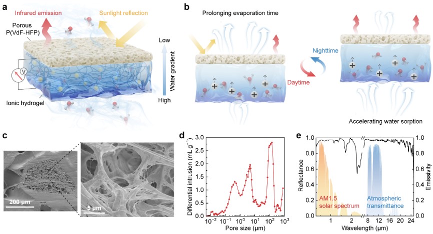 研究團(tuán)隊(duì)提出了通過輻射致冷調(diào)控太陽輻射和環(huán)境溫度,輔助實(shí)現(xiàn)高效穩(wěn)定濕氣發(fā)電的新策略。研究人員設(shè)計(jì)了一種由疏水多孔聚偏氟乙烯-六氟丙烯 [P(VdF-HFP)] 頂層和親水離子水凝膠底層組成的濕度發(fā)電器件。由聚乙烯醇(PVA)和植酸(PA)建立的離子水凝膠網(wǎng)絡(luò),與削弱氫鍵相互作用的LiCl結(jié)合,賦予PP/IH優(yōu)異的吸濕能力、豐富的解離電荷載體和高效的水/離子傳輸性能。水凝膠可自發(fā)吸收空氣中的水分并解離出離子,頂層疏水多孔結(jié)構(gòu)可自發(fā)驅(qū)動(dòng)水分解吸,基于此構(gòu)建的吸附-解吸動(dòng)態(tài)平衡驅(qū)動(dòng)水/離子連續(xù)流過帶負(fù)電荷的納米通道,產(chǎn)生持續(xù)電力輸出。與此同時(shí),分級多孔頂層的輻射冷卻效應(yīng)在日間降低蒸發(fā)溫度,保證連續(xù)定向水/離子流動(dòng),在夜間有效平衡吸附放熱,提高吸附速率,促進(jìn)水分梯度恢復(fù),實(shí)現(xiàn)晝夜交替中穩(wěn)定的吸附-解吸循環(huán)。