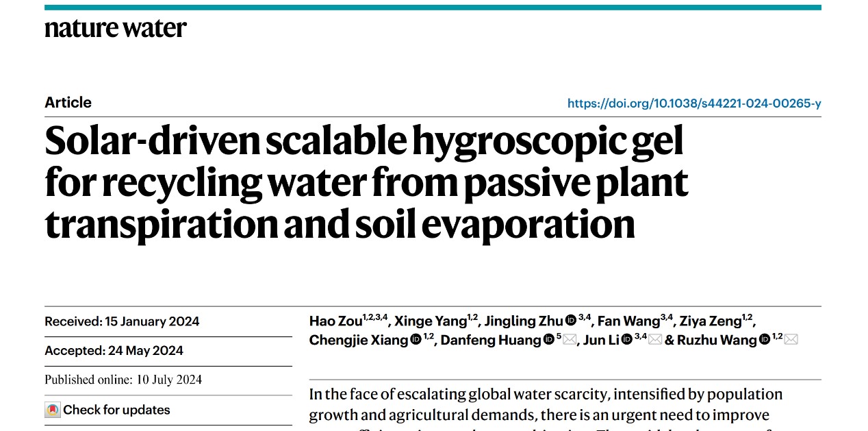 近日,制冷與低溫工程研究所王如竹教授ITEWA(Innovative Team for Energy, Water & Air)團(tuán)隊在Nature Water期刊上發(fā)表了題為“Solar-driven Scalable Hygroscopic Gel for Passive Plant Transpiration and Soil Evaporation Water Recycling”的研究論文。論文針對溫室生產(chǎn)中水資源利用效率低下的問題,提出了一種基于太陽能驅(qū)動吸濕性水凝膠材料的植物蒸騰和土壤蒸發(fā)水回收裝置,該裝置在不影響植物光合作用及正常生長的前提下,實(shí)現(xiàn)了溫室內(nèi)部的高效水循環(huán)和再利用。論文第一作者為制冷與低溫工程研究所博士生鄒豪,王如竹教授、農(nóng)業(yè)與生物學(xué)院黃丹楓教授和新加坡國立大學(xué)李俊教授為通訊作者。