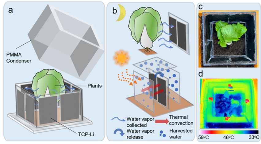 因此,為了解決全球水資源短缺問題并提高溫室中的水資源利用效率,該論文針對材料動力學(xué)特性、部署位置的氣候特點(diǎn)以及植物生長特性,進(jìn)行了材料與工程交叉學(xué)科的優(yōu)化,從而開發(fā)了一種名為TEAD的裝置來優(yōu)化灌溉水的利用。TEAD包括一種多組分互連,具有良好擴(kuò)展性和可靠粘附性能的吸濕多孔凝膠TCP-Li。得益于精細(xì)的合成工藝和各個合成材料的有效性能表達(dá),合成的TCP-Li表現(xiàn)出高達(dá)3.38g/g的吸水性能,并在自然陽光下具有快速解吸能力。在溫室測試中,TEAD能夠在不影響植物光合作用及正常生長的前提下,實(shí)現(xiàn)溫室內(nèi)部的高效水循環(huán)和再利用,裝置取水量高達(dá)每株87.1g以及每平米1890.6g,從而節(jié)約44.9%的灌溉用水。結(jié)合以上優(yōu)點(diǎn),該設(shè)計為進(jìn)一步提高溫室水資源利用效率提供了一種新方法,有望緩解全球水危機(jī)并減少農(nóng)業(yè)用水浪費(fèi)。