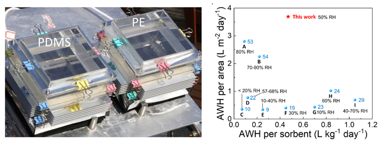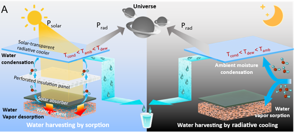 為了滿足干旱地區(qū)的用水需求,開發(fā)新的水源極為重要。大氣中蘊藏著豐富的水蒸氣,其含量約為全球每年消耗水量的3.4倍,基于水蒸氣吸附的大氣水收集技術(shù)(S-AWH)近年來受到廣泛關(guān)注,利用吸附材料和空氣取水設(shè)備可以從空氣中攫取水分,實現(xiàn)隨時隨地飲用水生產(chǎn)。然而,吸附式空氣取水技術(shù)面臨著高能耗和低產(chǎn)水量的瓶頸。為此,論文提出了一種耦合利用太陽能光熱和全天輻射致冷實現(xiàn)全天高效空氣取水新策略。為了構(gòu)建緊湊高效的空氣取水裝置,論文采用透射型輻射冷卻膜(TRC)允許太陽光透過輻射致冷膜,實現(xiàn)了同一占地面積下的頂部日間輻射致冷與底部光熱轉(zhuǎn)化集熱。白天運行時,陽光透過TRC膜加熱吸附材料驅(qū)動水蒸氣釋放,釋放的水蒸氣在TRC膜表面快速凝結(jié)集水。夜晚運行時,吸附材料從空氣中捕獲水蒸氣,同時周圍空氣中高濕度的水蒸氣在TRC膜上凝結(jié),實現(xiàn)夜間輻射致冷驅(qū)動的直接產(chǎn)生水。