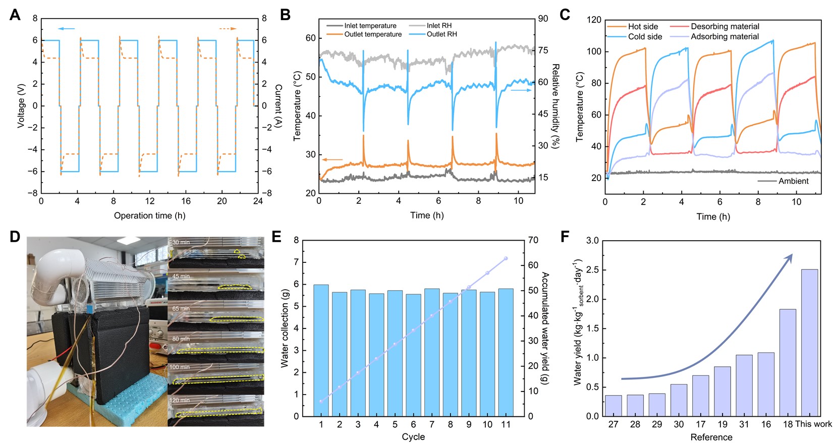 研究團隊選用金屬有機框架材料Ni2Cl2(BTDD)作為大氣水吸附劑,采用原位浸漬法制備得到具有快速水蒸氣吸附-解吸動力學(xué)特性的MOF涂層吸附模塊,設(shè)計搭建了一款小型吸附式熱電濕泵,采用多循環(huán)吸附-解吸同步運行策略以實現(xiàn)連續(xù)式空氣取水耦合區(qū)域濕度調(diào)節(jié)目標(biāo)。實驗結(jié)果顯示,裝置吸附側(cè)出口空氣濕度由72% RH降到58% RH,連續(xù)運行11個循環(huán)取得2510 mLwater·kg-1MOF·day-1的日產(chǎn)水量,優(yōu)于現(xiàn)有的大多數(shù)主動式空氣取水裝置,與吸附劑本身的吸濕能力相比,多循環(huán)連續(xù)運行策略使其吸附性能提升了約3.7倍。