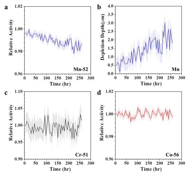 高溫熔鹽具有運(yùn)行溫度高、工作壓力低、傳儲(chǔ)熱性能強(qiáng)、成本低及化學(xué)性能穩(wěn)定等優(yōu)點(diǎn),在高溫熔鹽堆、乏燃料干法后處理、太陽(yáng)能光熱、可再生能源存儲(chǔ)等領(lǐng)域得到了廣泛應(yīng)用。然而,高溫熔鹽環(huán)境結(jié)構(gòu)材料腐蝕嚴(yán)重,已成為制約其應(yīng)用前景的重要因素之一。目前,由于技術(shù)水平的限制,流動(dòng)熔鹽環(huán)境中材料的腐蝕機(jī)理和腐蝕產(chǎn)物流動(dòng)機(jī)制尚未揭示。針對(duì)以上問(wèn)題,研究提出了一種基于放射性核素示蹤技術(shù)的原位腐蝕及腐蝕產(chǎn)物輸運(yùn)監(jiān)測(cè)方法,用于研究316L不銹鋼(316L SS)在NaCl-MgCl2共晶熔鹽自然循環(huán)回路中的腐蝕特性。該方法采用16MeV質(zhì)子對(duì)熱端管道進(jìn)行回旋加速器輻照,從而在熔鹽與合金界面產(chǎn)生放射性核素51Cr、52Mn和56Co。通過(guò)測(cè)量這些放射性核素在回路管道不同位置的放射性活度變化,實(shí)現(xiàn)了316L SS腐蝕侵蝕深度的原位監(jiān)測(cè),以及腐蝕產(chǎn)物在流動(dòng)NaCl-MgCl2熔鹽中傳輸和沉積的實(shí)時(shí)追蹤。