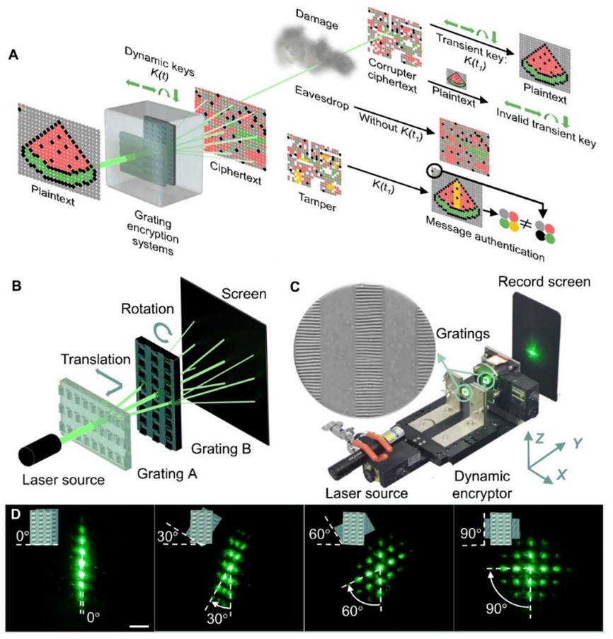 多個可調(diào)參數(shù)的設計保證了系統(tǒng)生成大空間容量動態(tài)密鑰的能力,研究團隊以參數(shù)及褶皺光柵的組合為加密密鑰,設計了一種具有防竊聽、防損壞和防篡改效果的動態(tài)光加密通信方法。該方法利用多重光柵衍射的冗余特性,在傳輸過程中有效防止了因數(shù)據(jù)損壞造成的讀取失敗,所設計的動態(tài)密鑰機制保護了通信安全。研究團隊還設計了驗證模塊來確保數(shù)據(jù)的完整性,防止惡意篡改。團隊設計的光通信方法通過綜合利用動態(tài)密鑰、光柵衍射特性和驗證模塊,實現(xiàn)了高度安全和可靠的通信,為微納結(jié)構(gòu)表面在光加密通信方面的應用提供了新思路。