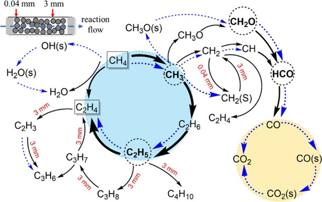 甲烷作為重要的C1分子,其清潔、高效轉(zhuǎn)化利用研究已得到了持續(xù)且廣泛的關(guān)注。OCM被廣泛認(rèn)為是將甲烷直接轉(zhuǎn)化為C2產(chǎn)物(如乙烷和乙烯)的最有前途的方法之一(圖1)。OCM反應(yīng)的熱效應(yīng)會(huì)顯著影響產(chǎn)物的形成和分布,局部過熱會(huì)加劇深度氧化,進(jìn)而降低C2產(chǎn)率。深入理解OCM復(fù)雜的氣-固兩相反應(yīng)機(jī)理并發(fā)展微觀反應(yīng)動(dòng)力學(xué)模型,將為催化劑、反應(yīng)器的設(shè)計(jì)以及工業(yè)操作條件的優(yōu)化提供理論指導(dǎo)。