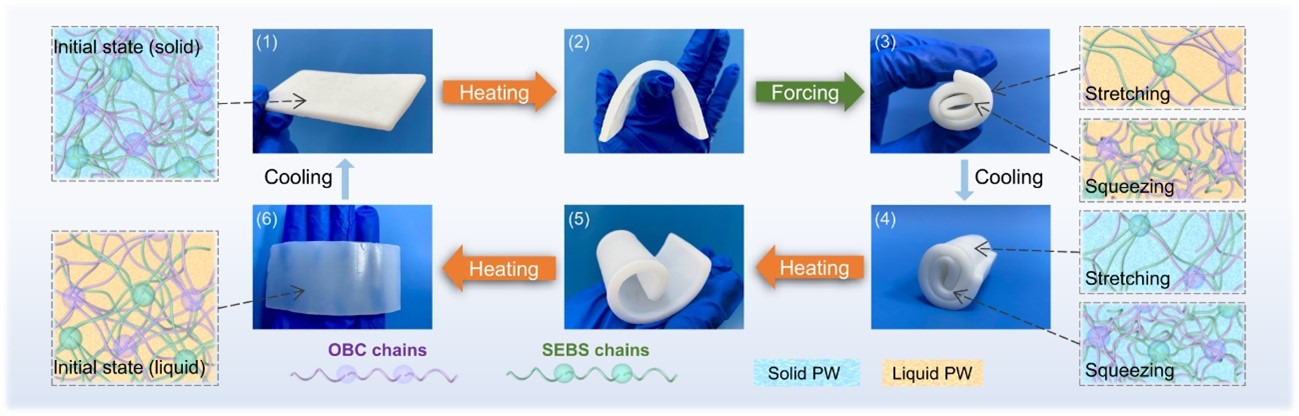 研究人員成功制備了超柔性定形相變儲熱復(fù)合材料PW@OBC-SEBS,將相變材料PW嵌入C-C鍵強化的SEBS-OBC雙聚合物網(wǎng)絡(luò)結(jié)構(gòu),實現(xiàn)了相變材料的定形封裝,可以在加熱-冷卻循環(huán)條件下維持良好的熱穩(wěn)定性和柔性特征。通過化學(xué)反應(yīng)路徑分析和實驗測試,研究發(fā)現(xiàn)該化學(xué)交聯(lián)方法合成的儲熱復(fù)合材料相對傳統(tǒng)物理混合技術(shù)制備的復(fù)合材料,展現(xiàn)出顯著的聚合物化學(xué)交聯(lián)增韌效應(yīng)和熱穩(wěn)定性,斷裂伸長率達560%。該材料經(jīng)過500次循環(huán)試驗后仍保持穩(wěn)定的柔性功能,且在高于相變溫度的熱空氣和熱水環(huán)境下具有穩(wěn)定的定形效果而不出現(xiàn)液體泄漏,相變焓值高達176 kJ/kg,具有優(yōu)異的儲熱能力。