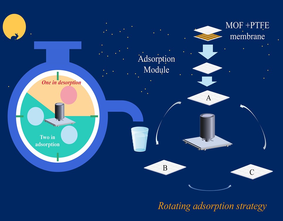 針對該材料特性合作團隊開發(fā)了可適應規(guī)模化應用的封裝方案并設計了全新的運行策略。不同于常規(guī)單吸附模塊的設計,該策略中使用了多吸附模塊以實現(xiàn)裝置的準連續(xù)運行,而吸附模塊數(shù)量經(jīng)過了吸附動力學與脫附動力學的匹配,類似“輪盤”的運行策略可以同時保證裝置的連續(xù)運行以及吸附劑模塊的充分吸附。在該研究中,基于此設計思路及擬合結(jié)果,研究人員最終采用了三塊相同的吸附模塊進行策略演示并據(jù)此設計了可突破日夜限制的低溫位熱能驅(qū)動的空氣取水裝置。