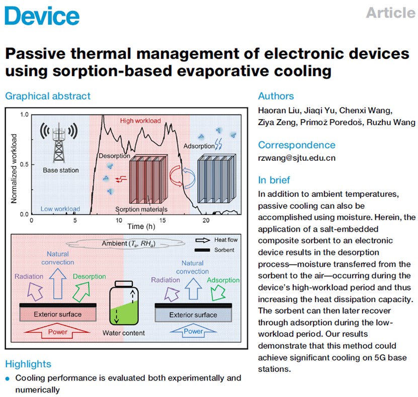 近日,上海交通大學(xué)王如竹教授領(lǐng)銜的“能源-水-空氣”交叉學(xué)科創(chuàng)新團(tuán)隊(duì)ITEWA(Innovation Team for Energy, Water & Air)在Cell姊妹刊Device上發(fā)表了題為“Passive thermal management of electronic devices using sorption-based evaporative cooling”的研究論文。論文針對(duì)5G通信基站高負(fù)荷下的散熱問題,提出了一種基于吸附的被動(dòng)散熱技術(shù),有望打破原有被動(dòng)散熱技術(shù)瓶頸,為未來電子設(shè)備散熱提供新機(jī)遇。制冷與低溫工程研究所博士生劉浩然和余佳琦是論文的共同第一作者,王如竹教授為通訊作者。