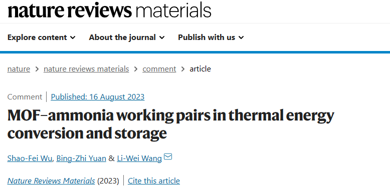 近日,上海交通大學(xué)機械與動力工程學(xué)院王麗偉教授團(tuán)隊在Nature Reviews Materials上發(fā)表“MOF-ammonia working pairs in thermal energy conversion and storage”評論文章,闡述了金屬有機框架(MOF)—氨工質(zhì)對用于極端氣候下高效制冷與儲熱的優(yōu)勢,總結(jié)了高穩(wěn)定性和高吸附量MOFs的合成策略和性能評價方法,展望了該工質(zhì)對未來的發(fā)展方向。機械與動力工程學(xué)院博士研究生吳韶飛為論文第一作者,王麗偉教授為通訊作者。