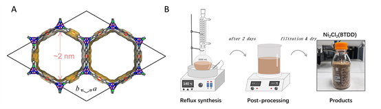 在材料層面,研究團(tuán)隊(duì)經(jīng)過(guò)篩選,選擇Ni2Cl2(BTDD)作為首選材料。其一維孔道具有豐富且親水的開(kāi)放金屬位點(diǎn),優(yōu)異的水穩(wěn)定性和水吸附性能使其從眾多MOF材料中脫穎而出。論文通過(guò)操作簡(jiǎn)易的回流法實(shí)現(xiàn)了百克級(jí)Ni2Cl2(BTDD)的制備,并結(jié)合配體和金屬鹽的溶解特性,依次采用水、N,N-二甲基乙酰胺以及甲醇洗滌的操作進(jìn)行材料后處理以釋放孔道。相比于現(xiàn)有的擴(kuò)大化合成方案,回流法的生產(chǎn)成本縮減至79 CNY g-1。