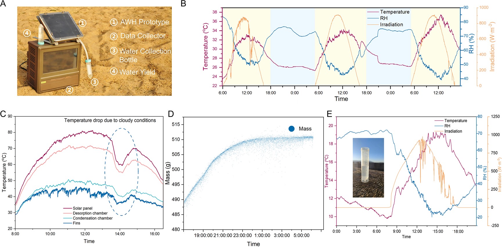 基于擴(kuò)大化合成吸附劑工藝探索,王如竹教授團(tuán)隊(duì)開(kāi)發(fā)了一種高度緊湊的模塊化且熱分區(qū)的空氣取水器。該樣機(jī)實(shí)現(xiàn)了Ni2Cl2(BTDD)在裝置層面的首次應(yīng)用,在實(shí)驗(yàn)室條件下實(shí)現(xiàn)了在裝置每平米僅使用不到四分之一重量吸附劑的情況下,得到可媲美復(fù)雜雙級(jí)結(jié)構(gòu)取水器的840.5 g m–2高取水量,以及23 L m–3的超高體積取水密度。為了進(jìn)一步對(duì)裝置性能進(jìn)行檢驗(yàn),研究團(tuán)隊(duì)在上海、昆明等不同地點(diǎn)進(jìn)行了實(shí)地測(cè)試,并對(duì)所得水樣進(jìn)行了水質(zhì)測(cè)試。在昆明干旱寒冷的冬季,該取水機(jī)組在0.04 m2依然實(shí)現(xiàn)了22.6g的高水生產(chǎn)量,且水樣離子濃度滿足WHO對(duì)于直接飲用的要求。