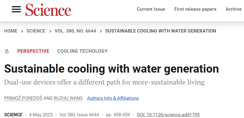 5月4日,上海交通大學(xué)機(jī)械與動(dòng)力工程學(xué)院制冷與低溫工程研究所王如竹團(tuán)隊(duì)在Science發(fā)表了題為“Sustainable cooling with water generation”的Perspective前瞻性文章。論文從能源-空氣-水之間耦合聯(lián)系的角度,分析了現(xiàn)有炎熱干燥地區(qū)實(shí)現(xiàn)空氣溫度-濕度調(diào)控的挑戰(zhàn),提出通過吸附式空氣取水、熱泵、輻射制冷技術(shù)的耦合設(shè)計(jì),實(shí)現(xiàn)用于炎熱干旱地區(qū)的可持續(xù)制冷以及淡水收集協(xié)同。上海交通大學(xué)制冷與低溫工程研究所博士后Primo? Poredoš為論文第一作者,王如竹教授為通訊作者。