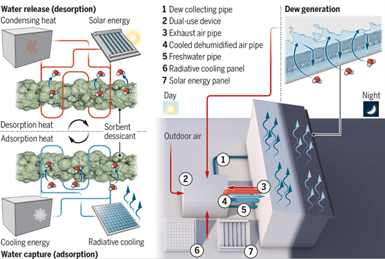 如何避免使用能量密集過程,以淡水生產(chǎn)作為副產(chǎn)品實(shí)現(xiàn)可持續(xù)冷卻?論文提出需要拓展現(xiàn)有制冷和冷卻技術(shù)的邊界,將其與吸附式空氣取水、熱泵、輻射制冷等先進(jìn)技術(shù)有機(jī)結(jié)合,對(duì)水分-能量熱力過程進(jìn)行調(diào)控,解決炎熱、干旱的地區(qū)高效空調(diào)制冷以及淡水協(xié)同收集的難題,為實(shí)現(xiàn)全球綠色低碳轉(zhuǎn)型和可持續(xù)發(fā)展提供新的途徑。鑒于炎熱干旱地區(qū)具有晴天和充足的陽(yáng)光的氣候特點(diǎn),論文提出利用太陽(yáng)光熱-儲(chǔ)熱熱能以及天空輻射制冷冷能分別協(xié)調(diào)增強(qiáng)吸附劑(干燥劑)解吸和吸附過程,進(jìn)而為利用吸附-解吸過程中同時(shí)存在水分和能量的儲(chǔ)存和傳輸效應(yīng)、協(xié)調(diào)處理空氣溫濕度提供可能。