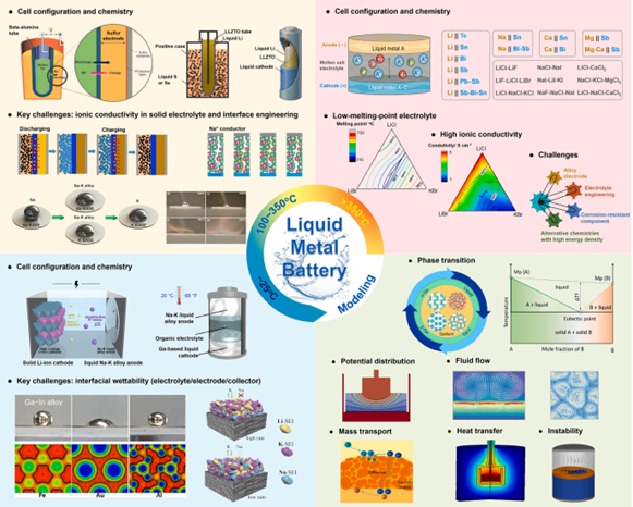 在眾多類型的儲能技術(shù)中,電化學(xué)儲能具有能量密度高、響應(yīng)快、建設(shè)周期短、安裝靈活等優(yōu)勢。對于固定式、規(guī)模化的儲能應(yīng)用,評價電池性能的關(guān)鍵指標(biāo)有經(jīng)濟性、安全性、能量密度、功率密度、能量效率等。針對這些指標(biāo),國內(nèi)外學(xué)者重點關(guān)注采用儲量豐富的材料作為電池活性材料,發(fā)展本征安全電池體系,探索新的電池化學(xué)(正負極材料和電解質(zhì))等,以替代目前占主導(dǎo)地位但面臨成本高、資源不足、安全事故頻發(fā)等突出問題的鋰離子電池。由于可充電液態(tài)金屬電池具有長壽命、低成本、大容量及高安全性等優(yōu)勢,而廣義上的液態(tài)金屬電池為至少包含一種液態(tài)金屬電極的電化學(xué)儲能器件,金屬電極的液態(tài)化使這類電池擺脫了傳統(tǒng)固態(tài)電極材料因結(jié)構(gòu)穩(wěn)定性差、易產(chǎn)生枝晶而導(dǎo)致的循環(huán)壽命短、熱失控等問題,并且液態(tài)電極獨特的傳質(zhì)與反應(yīng)動力學(xué)特性使這類電池具有大容量、高功率等優(yōu)點。現(xiàn)階段,部分高溫液態(tài)金屬電池已初步實現(xiàn)商業(yè)化,而新興的中低溫/室溫液態(tài)金屬電池尚處于研究初始階段,仍面臨著循環(huán)穩(wěn)定性、經(jīng)濟性等多方面挑戰(zhàn)。