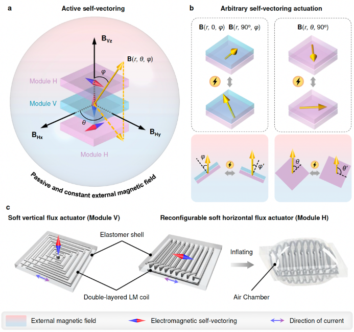 研究團(tuán)隊(duì)利用嵌入的液態(tài)金屬制造出可重構(gòu)的兩類典型的軟電磁線圈,即具有垂直電磁矢量的平面螺旋線圈和具有水平電磁矢量的三維可重構(gòu)螺線管線圈。通過不同重構(gòu)策略將兩類基本模塊復(fù)合疊加,實(shí)現(xiàn)了三維空間內(nèi)任意方向的矢量合成。模塊化的“自矢量機(jī)器人”通過簡單的電流控制即可實(shí)現(xiàn)即時高效的可重新編程、獨(dú)立的子域驅(qū)動和全方向的矢量操控,通過最少數(shù)量的驅(qū)動器展示了更高維度的變形和運(yùn)動。研究分別實(shí)現(xiàn)了單驅(qū)動器和單路控制信號的適應(yīng)復(fù)雜地形的連續(xù)翻滾和雙向翻滾運(yùn)動,以及兩個驅(qū)動器和兩路控制信號控制的全向翻滾運(yùn)動和平面全向定位操控;展示了無需復(fù)雜多源控制和輔助設(shè)備,而僅通過兩路電流信號控制的高維可重編程形狀變形;另外實(shí)現(xiàn)了仿蠕蟲的雙向爬行和轉(zhuǎn)向,以及翻滾、全向爬行及原位旋轉(zhuǎn)等運(yùn)動,并且展示了集成控制系統(tǒng)的無拖纜水面游動和自帶磁鐵的水下游動。“自矢量”策略將為人機(jī)交互、醫(yī)療應(yīng)用、主動超材料等領(lǐng)域帶來新的啟發(fā)。