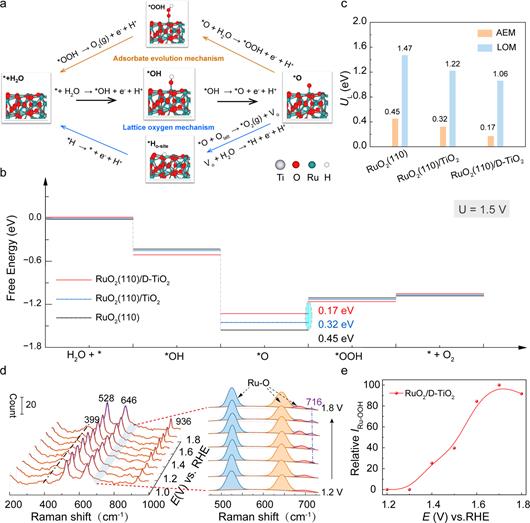 圖2. RuO2模型表面OER的反應(yīng)路徑和能壘分析,以及電化學(xué)原位拉曼表征
