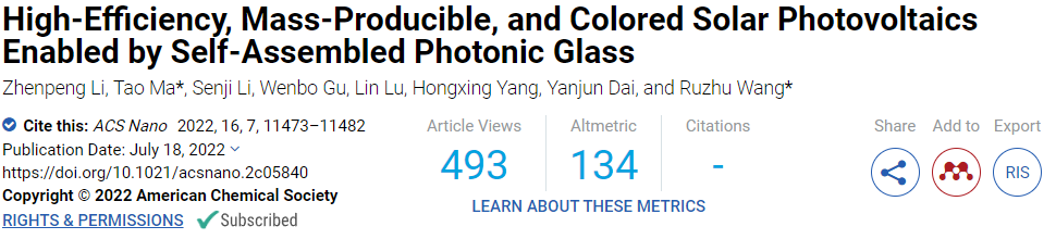 近日,上海交通大學(xué)制冷與低溫工程研究所、太陽能發(fā)電及制冷教育部工程研究中心馬濤、代彥軍和王如竹等,聯(lián)合香港理工大學(xué)楊洪興教授和呂琳教授,在美國化學(xué)學(xué)會(huì)旗下期刊ACS Nano上發(fā)表了題目為“High-Efficiency, Mass-Producible, and Colored Solar Photovoltaics Enabled by Self-Assembled Photonic Glass”的研究論文,首次將光子玻璃(Photonic Glass)應(yīng)用于彩色光伏中的顏色產(chǎn)生層,從而提出了一種新的低成本高效彩色光伏技術(shù)。論文第一作者為制冷與低溫工程研究所博士生李貞鵬,馬濤副教授和王如竹教授為共同通訊作者。
