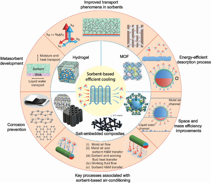 空調(diào)的大量使用對全球溫室氣體排放平衡構(gòu)成了巨大負(fù)擔(dān)。當(dāng)前和未來全球濕度對與空調(diào)相關(guān)的溫室氣體排放具有重大影響,將潛熱負(fù)荷(濕度)與顯熱負(fù)荷(溫度)分開的解耦處理,通過吸附材料控制濕度和潛熱負(fù)荷,具有巨大的碳減排潛力,尤其是在炎熱和潮濕的氣候地區(qū)。目前,對于空調(diào)系統(tǒng)的可持續(xù)發(fā)展及其碳減排具有迫切需求。將空氣中的水分(濕度)分離出來,將有效減少空調(diào)運行負(fù)荷,達(dá)到節(jié)能減排效果。具體來說,可以利用水蒸氣吸附/吸收材料來捕獲空氣中的水蒸氣,不需要消耗額外能量的分離濕負(fù)荷。而在高溫驅(qū)動下,吸附材料釋放水分,實現(xiàn)解吸和再生。該再生過程可以采用低品位能源(余熱),甚至太陽能驅(qū)動,進(jìn)而降低能耗及碳排放。