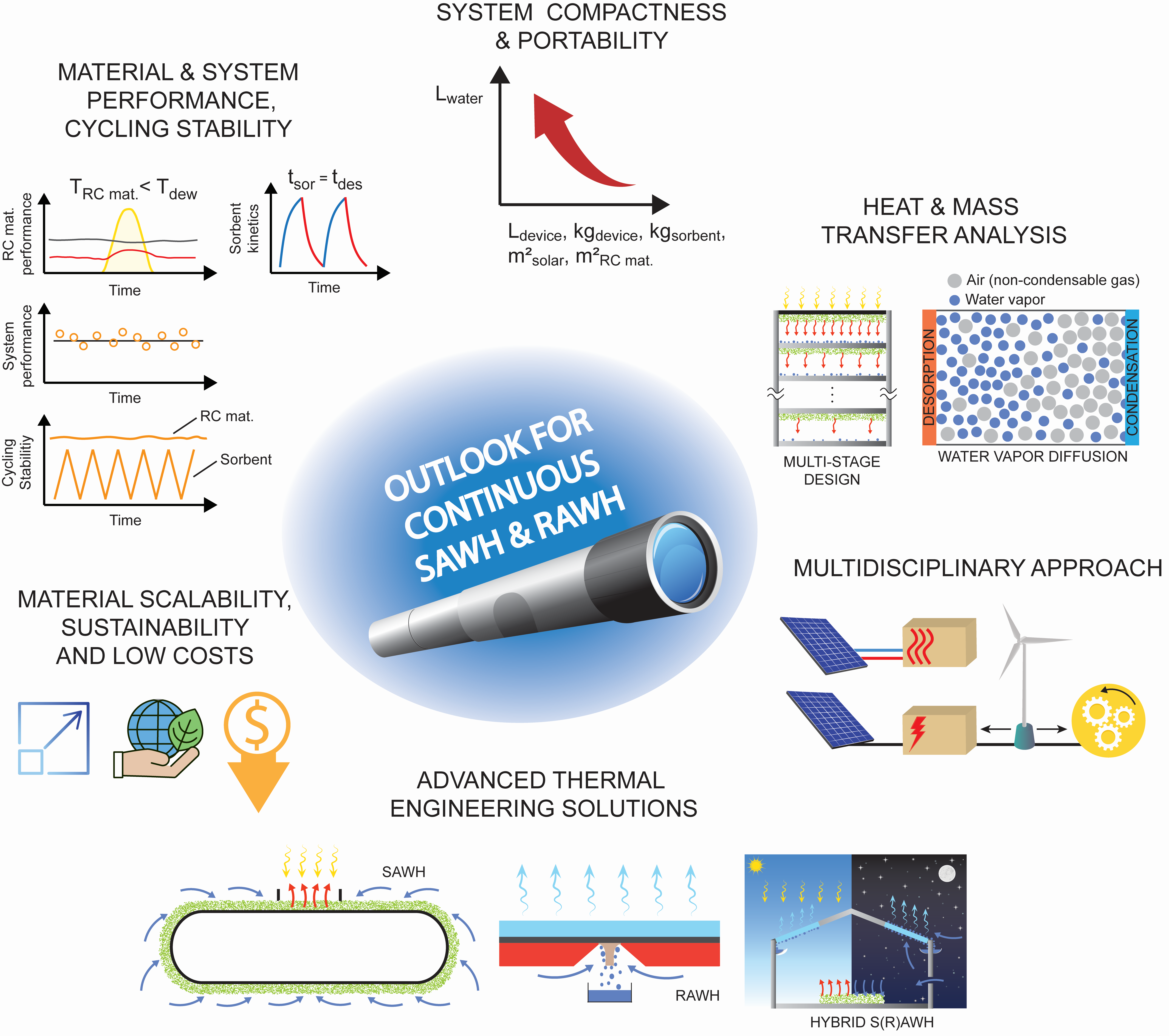 近日,制冷與低溫工程研究所王如竹教授領(lǐng)銜的“能源-水-空氣” 交叉學科創(chuàng)新團隊ITEWA(Innovative Team for Energy, Water & Air)在能源環(huán)境領(lǐng)域期刊 Energy & Environmental Science發(fā)表題為 Sustainable water generation: Grand challenges in continuously atmospheric water harvesting的展望論文。該論文歸納了現(xiàn)有太陽能驅(qū)動的吸附式空氣取水系統(tǒng)和輻射冷卻空氣取水系統(tǒng)在材料和系統(tǒng)兩方面的發(fā)展及存在的技術(shù)瓶頸,強調(diào)了太陽能驅(qū)動連續(xù)式空氣取水的前景和可能性,展望了連續(xù)式空氣取水系統(tǒng)的發(fā)展方向,以期推動空氣取水實現(xiàn)產(chǎn)水效率和產(chǎn)量的跨越。本文第一作者為制冷與低溫研究所博士后Primo? Poredoš,通訊作者是王如竹教授。