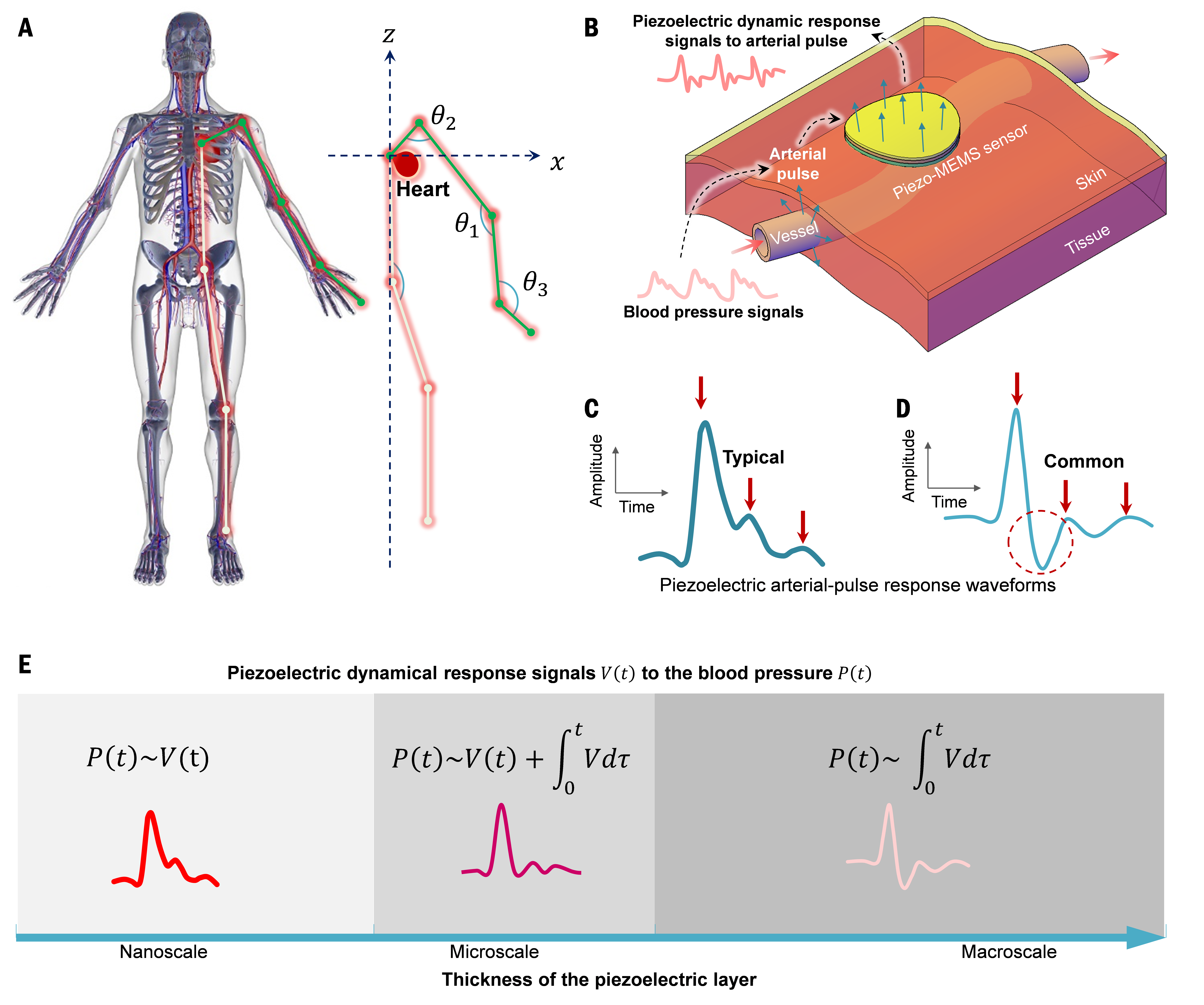 穿戴式血壓連續(xù)監(jiān)測(cè)技術(shù)因其監(jiān)測(cè)過程的便攜性而得到廣泛研究,為解決傳統(tǒng)血壓測(cè)量的問題提供了重要的發(fā)展途徑。目前報(bào)道的穿戴式壓電脈搏傳感技術(shù)在監(jiān)測(cè)到的脈搏波方面表現(xiàn)出很大的差異性,一部分研究認(rèn)為壓電脈搏波與動(dòng)脈血壓波存在積分關(guān)聯(lián)的波動(dòng)特性,而另一部分研究則呈現(xiàn)出壓電脈搏波與血壓波一致的波動(dòng)特性。這種尚未厘清的關(guān)聯(lián)關(guān)系不僅影響傳統(tǒng)穿戴血壓監(jiān)測(cè)方法中脈搏波特征點(diǎn)選取的合理性,也影響基于脈搏波直接評(píng)估動(dòng)脈血壓波動(dòng)特征的可靠性。因此,實(shí)現(xiàn)穿戴式血壓連續(xù)監(jiān)測(cè)仍是一個(gè)重大的挑戰(zhàn),闡明動(dòng)脈脈搏壓電響應(yīng)的動(dòng)力學(xué)特征,對(duì)于穿戴式脈搏傳感技術(shù)和連續(xù)血壓監(jiān)測(cè)系統(tǒng)的發(fā)展是非常必要的,也具有重要應(yīng)用價(jià)值和現(xiàn)實(shí)意義。