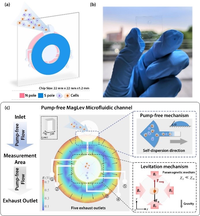 近日,上海交大機械與動力工程學院振動、沖擊、噪聲研究所張文明教授團隊聯(lián)合生物醫(yī)學工程學院康亞妮副教授團隊開展交叉學科研究,在生物傳感領域期刊BIOSENSORS & BIOELECTRONICS上發(fā)表了題為Pump-Free Microfluidic Magnetic Levitation Approach For Density-based Cell Characterization的研究論文,提出了自驅(qū)動式非標記抗磁懸浮密度表征方法,設計了多通路式微流體芯片,建立了微尺度懸浮物檢測力學模型,研究了微流體自驅(qū)動機制的加工工藝,實現(xiàn)了不同譜系及藥物作用下細胞密度的有效表征。論文第一作者是博士后高秋華,張文明教授為共同通訊作者。