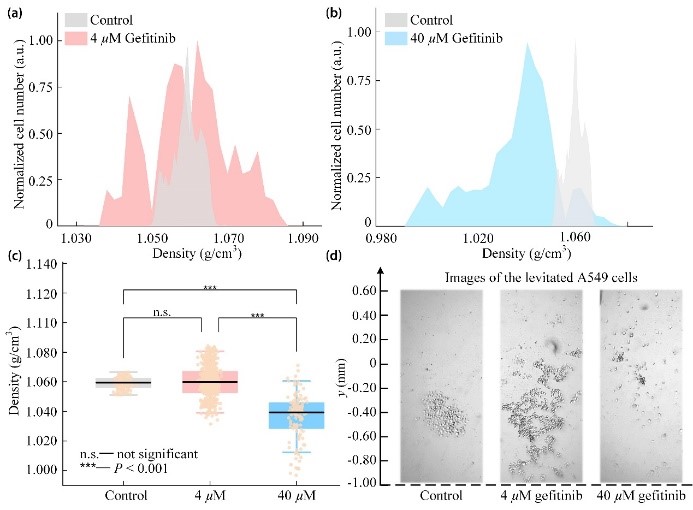 為了驗證方法有效性,論文分別對來自不同譜系的細胞進行密度表征。結(jié)果表明,相比于正常細胞,癌細胞在細胞密度與尺寸方面具有顯著的細胞異質(zhì)性。此外,該方法也可實現(xiàn)不同濃度藥物(吉非替尼)作用下肺癌細胞(A549)的密度檢測,為癌細胞異質(zhì)性表征及藥物作用效果評估提供了潛在的技術支撐。