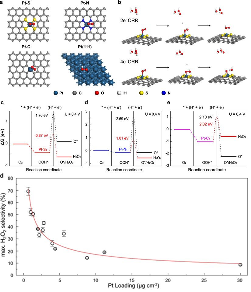 本體Pt催化劑被認(rèn)為是催化O2轉(zhuǎn)化為H2O的最佳單體金屬材料,但原子級(jí)分散的Pt催化劑在還原產(chǎn)物選擇性方面存在爭議。在這一工作中,作者通過將孤立的Pt原子分散在具有不同非金屬元素?fù)诫s的碳納米管(CNTs)基底上,制備了一系列具有不同配位環(huán)境和位點(diǎn)密度的Pt單原子催化劑(Pt-X-CNT, X = S, C, N)。實(shí)驗(yàn)結(jié)果表明,將Pt原子配位環(huán)境從Pt-C調(diào)整為Pt-N-C和Pt-S-C,反應(yīng)從4e−調(diào)控到2e−路徑,實(shí)現(xiàn)了從23.3%到81.4%的可控 H2O2選擇性,以及從0.30到2.67的H2O2/H2O轉(zhuǎn)換頻率比(0.4 V vs. RHE電位條件)。理論計(jì)算表明,對于反應(yīng)中間體*OOH,Pt-C位點(diǎn)有利于其進(jìn)一步解離還原,而Pt-S和Pt-N位點(diǎn)更傾向于將其質(zhì)子化生成H2O2。以Pt-N-C催化劑為例,作者進(jìn)一步證明了隨著Pt位點(diǎn)密度的增加,最大的H2O2選擇性可以從70%調(diào)控到20%,這為不同應(yīng)用場景下的氧還原調(diào)控提供了思路。