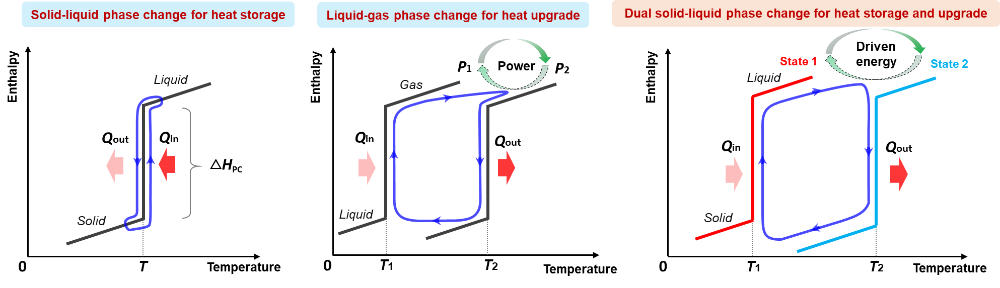 傳統(tǒng)材料的固液相變溫度近似恒定,適合用于熱能存儲;而氣液相變行為則表現(xiàn)為多相變特性,可通過改變飽和蒸氣壓力改變相變溫度,實際應用中表現(xiàn)為對熱能品位的調(diào)控,即蒸氣壓縮式熱泵或空調(diào)的熱力學原理,然而氣液相變由于體積變化大而一般不適合用于熱能存儲。如何打破傳統(tǒng)材料相變特性的熱力學限制,使其可同時用于熱能存儲與熱能品位調(diào)控,則是一項極具挑戰(zhàn)性的課題。通過深入調(diào)研分析,論文提出了利用特定材料的雙固液相變特性和可切換相變行為,解決傳統(tǒng)固液相變儲熱長期面臨的瓶頸難題。類似于氣液相變的多相變特性,特定材料在兩種狀態(tài)下具有不同的固液相變行為,通過某種能量驅(qū)動可實現(xiàn)兩種狀態(tài)的切換,該驅(qū)動能量可以是電能、電磁能、光能等。