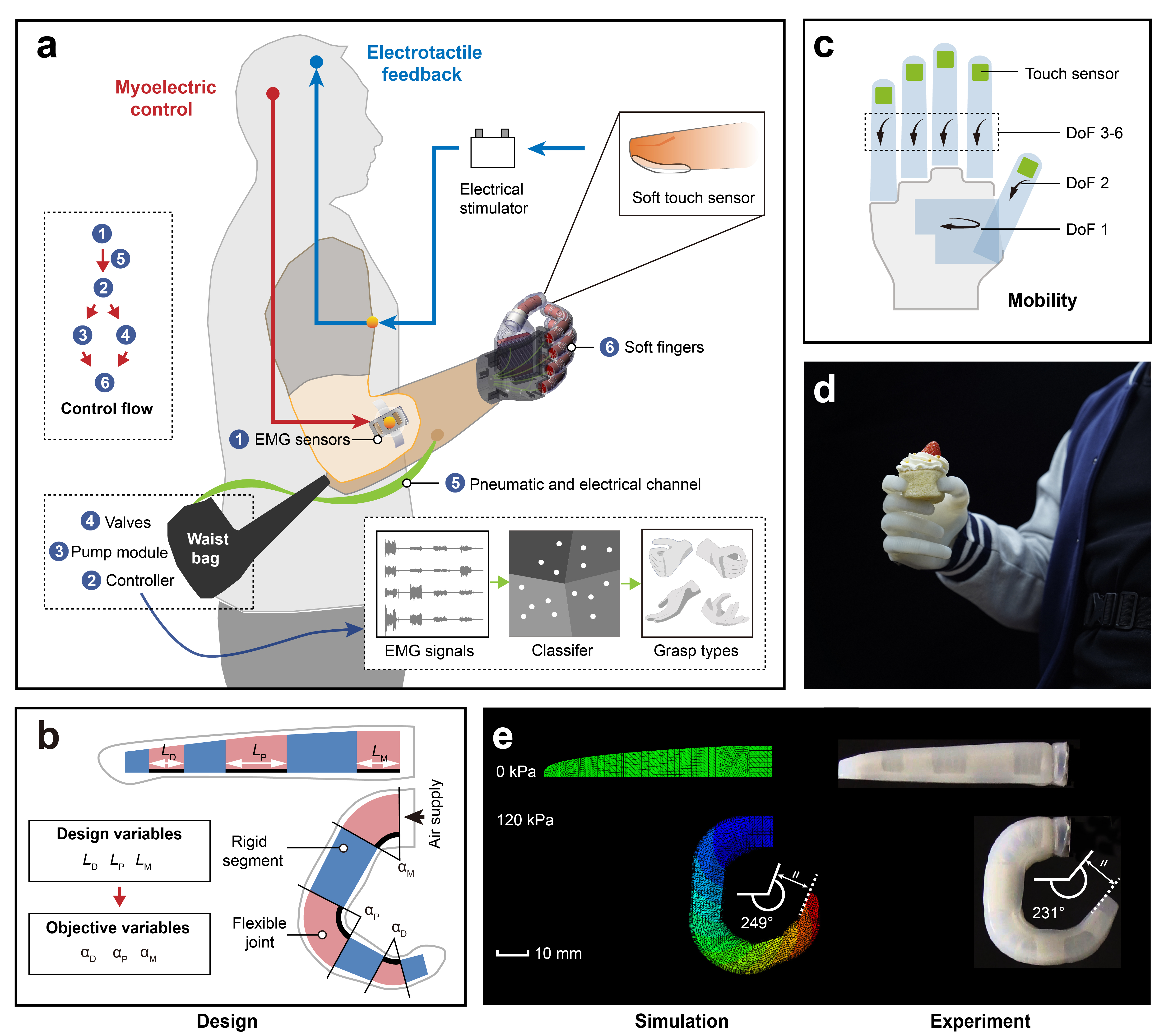 驅動控制硬件設計采用分布式模塊化思路。微型泵、閥、電路板、電池等器件可裝在輕量化腰包中,氣動軟體手指、傳感器等位于機械手本體中,腰包與機械手中的硬件通過隱藏的氣管和電線進行連接。根據(jù)需要,所有器件均可集成于假肢的接收腔內(nèi)。接收腔中嵌入了四個定制的肌電傳感器,用來記錄殘肢目標肌肉的表面肌電信號,并解碼截肢患者的運動意圖。各個軟體手指的指尖內(nèi)置了水凝膠-彈性體混合結構的柔性壓力傳感器,并集成了電觸覺系統(tǒng),具備觸覺壓力等外部感知信息的神經(jīng)反饋功能,可實現(xiàn)假肢手與神經(jīng)系統(tǒng)的雙向閉環(huán)控制。