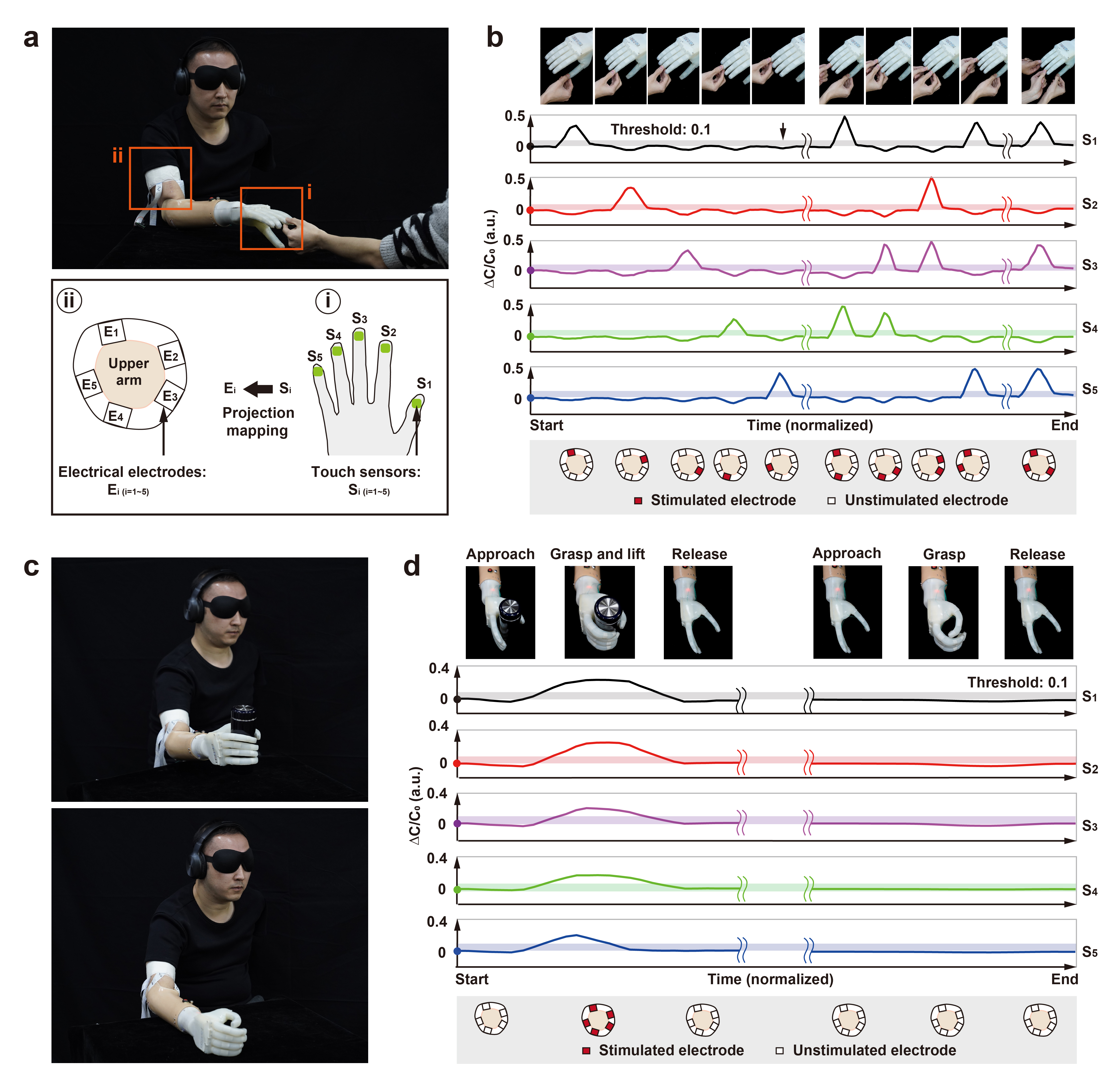 當指尖觸覺傳感器上的有效壓力達到設定閾值時,將觸發(fā)電刺激器產(chǎn)生電脈沖并刺激殘肢肌肉的特定區(qū)域,實現(xiàn)觸覺信號的神經(jīng)反饋。在視覺-聽覺屏蔽的交互實驗中,隨機按壓軟體神經(jīng)假肢手的五個手指,截肢受試者可以準確分辨出任意單個或多個被按壓的手指。實驗結果表明,結合肌電控制和觸覺反饋可實現(xiàn)軟體神經(jīng)假肢手的閉環(huán)控制。此外,通過對電脈沖的頻率與壓力傳感器相對電容變化量的編碼映射,截肢受試者可以恢復分級觸覺感知能力,實現(xiàn)對不同尺寸抓握對象,如不同直徑柱體的識別與分辨。