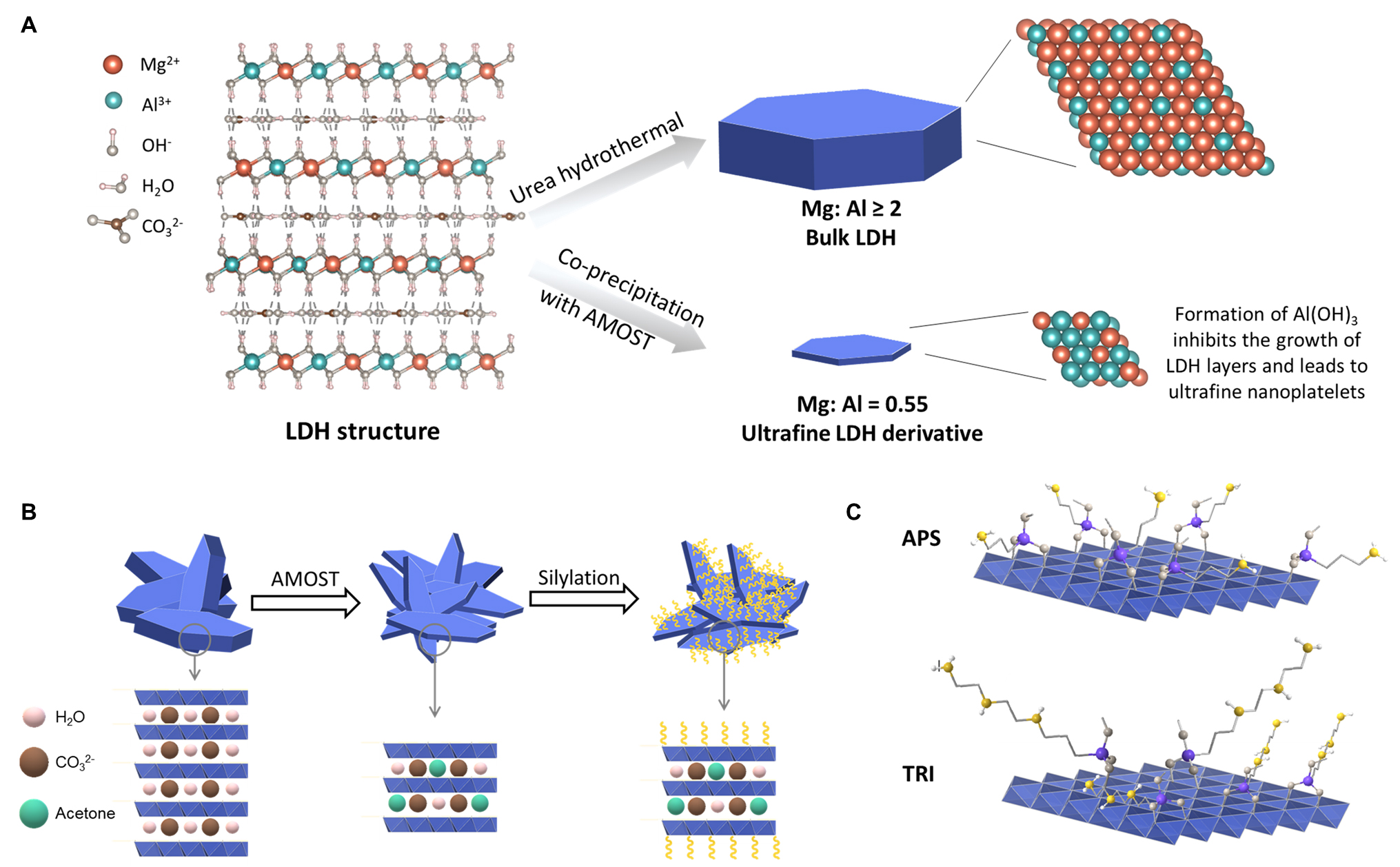 單分子層胺嫁接MgAl-LDH的制備示意圖:A) LDH衍生載體的合成;B) AMOST處理的LDH上的硅烷化反應(yīng);C) 胺嫁接的結(jié)構(gòu)