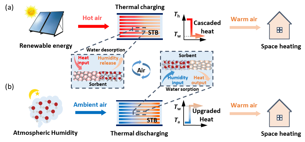 近日,制冷與低溫工程研究所王如竹教授和李廷賢研究員領(lǐng)銜的能源-空氣-水ITEWA團(tuán)隊(duì)(Innovative Team for Energy, Water & Air)在能源化學(xué)領(lǐng)域期刊ACS Energy Letters上發(fā)表了題目為“Ultrahigh-Energy-Density Sorption Thermal Battery Enabled by Graphene Aerogel-Based Composite Sorbents for Thermal Energy Harvesting from Air”的研究論文。該論文提出了基于石墨烯氣凝膠復(fù)合吸附劑的超高能量密度吸附熱池,通過石墨烯氣凝膠復(fù)合吸附劑與空氣中水蒸汽之間的解吸-吸附實(shí)現(xiàn)儲(chǔ)熱與放熱,同時(shí)通過熱力循環(huán)實(shí)現(xiàn)儲(chǔ)熱階段的熱能梯級利用和放熱階段的熱能提質(zhì)利用,能量密度可高達(dá)1580 Wh·kg-1, 是傳統(tǒng)顯熱/相變儲(chǔ)熱的20-30倍。論文第一作者是博士研究生嚴(yán)泰森和李廷賢研究員,通訊作者是李廷賢研究員和王如竹教授。