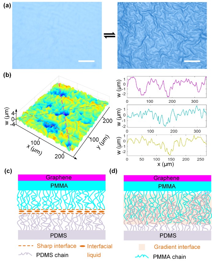 (a)可逆的多尺度石墨烯共形褶皺功能表面; (b) 三維形貌表征;(c-d) 多層系統(tǒng)中梯度界面層的化學成因