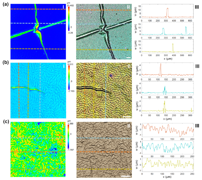 不同制造工藝下褶皺表面圖案對比研究:(a) 傳統(tǒng)濕法轉(zhuǎn)移;(b)傳統(tǒng)濕法轉(zhuǎn)移工藝,低溫多步平坦化工藝;(c) 后固化工藝。