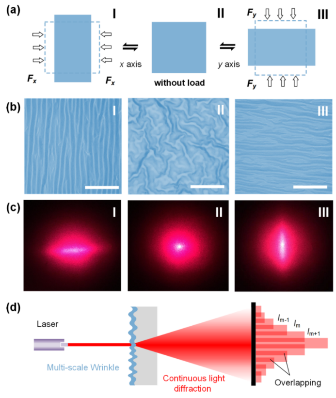 研究還觀測到多尺度共形石墨烯褶皺具有新奇的連續(xù)衍射現(xiàn)象,與傳統(tǒng)單一尺度褶皺結(jié)構(gòu)的離散衍射現(xiàn)象存在著顯著的差異。通過引入光柵衍射理論揭示上述現(xiàn)象的物理機制,研究表明:共形褶皺的多尺度性引起了多角度、多級衍射光的疊加效應(yīng)。上述石墨烯表面具有優(yōu)異的光學衍射性能與表面浸潤性,在光編碼加密技術(shù)、光操縱、光學雙穩(wěn)態(tài)器件和可調(diào)超疏水智能表面器件等應(yīng)用方面有著巨大的應(yīng)用價值。