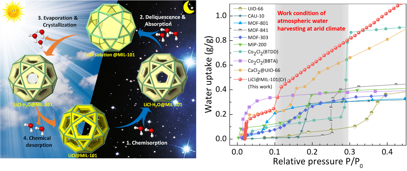 空氣取水技術(shù)是解決干旱地區(qū)水資源匱乏問題的重要思路和方法,其原理是采用吸附材料吸附夜間空氣中的水蒸汽,并在白天太陽能驅(qū)動(dòng)作用下實(shí)現(xiàn)水蒸汽脫附冷凝得到液態(tài)飲用水。美國麻省理工學(xué)院和加州大學(xué)伯克利分校合作率先報(bào)道了采用MOF-801實(shí)現(xiàn)干旱空氣取水的方法,吸附量為0.25kg水每千克MOF(Science 2017, 356, 430-434)。然而受限于目前吸附材料在低相對濕度下吸附量少的瓶頸問題,現(xiàn)有報(bào)道的空氣取水裝置取水量大多低于0.3kg水每千克吸附劑,難以進(jìn)行大規(guī)模商業(yè)化應(yīng)用。