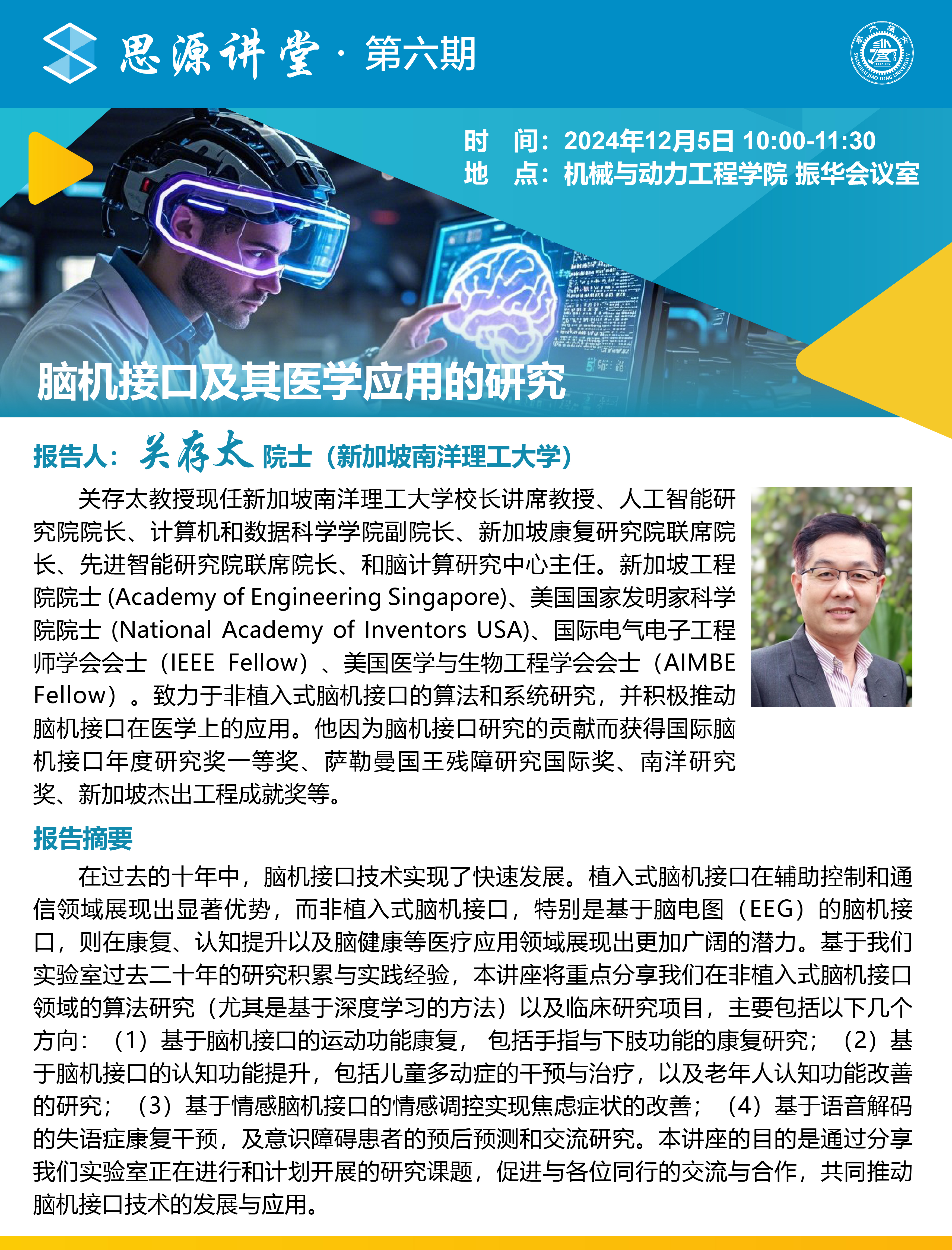 關存太教授現(xiàn)任新加坡南洋理工大學校長講席教授、人工智能研究院院長、計算機和數(shù)據(jù)科學學院副院長、新加坡康復研究院聯(lián)席院長、先進智能研究院聯(lián)席院長、和腦計算研究中心主任。關教授是新加坡工程院院士 (Academy of Engineering Singapore)、美國國家發(fā)明家科學院院士 (National Academy of Inventors USA)、國際電氣電子工程師學會會士(IEEE Fellow)、美國醫(yī)學與生物工程學會會士(AIMBE Fellow)。關教授致力于非植入式腦機接口的算法和系統(tǒng)研究,并積極推動腦機接口在醫(yī)學上的應用。他因為腦機接口研究的貢獻而獲得國際腦機接口年度研究獎一等獎、薩勒曼國王殘障研究國際獎、南洋研究獎、新加坡杰出工程成就獎等。