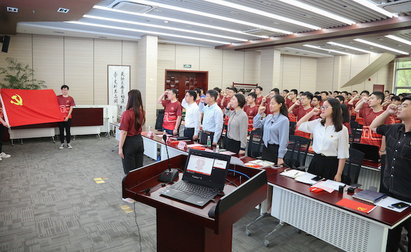 全體畢業(yè)生黨員在王玉婷的帶領(lǐng)下,面對黨旗,重溫入黨誓詞。