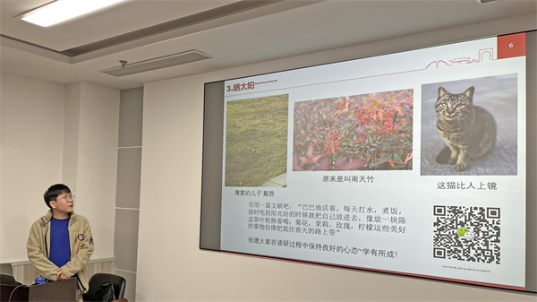 四位國獎得主依次進行了經驗分享報告。馬致遠分享了自身的科研成長經歷,告訴大家要坦然面對人生中的無力感,笑對困難,終會在不斷的努力中有所收獲;林濤從文獻閱讀,做事態(tài)度,科研方法三大方面向與會同學傳授自己的一些經驗感悟,告訴大家態(tài)度和方法是決定事情能否良好完成的關鍵;劉佳政從自己的實際科研課題出發(fā),為大家開展了一次精彩的學術報告;田希坤從課程內容學習,端正科研心態(tài),課題選擇問題及時間管理經驗四大方面向與會同學傳授經驗,告訴大家要正確對待所學過的課程知識,以夯實科研的基礎;對于科研要擺正心態(tài),確立明確目標,以自己的切身情況選擇合適的經驗方法進行學習,對于課題的選擇及推進,要多于導師交流,結合導師的思考更全面的看待問題。
