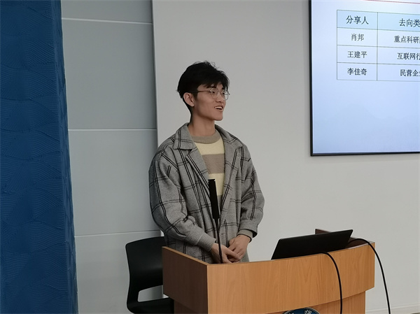 會議第二項,支部內(nèi)畢業(yè)生黨員就業(yè)分享。肖邦、王建平、李佳奇三名黨員先后分享了就業(yè)求職過程中的心得。他們首先對就業(yè)單位進(jìn)行了初步介紹,隨后分享了就業(yè)過程中遇到的問題與收獲,鼓勵與會同志明確自身偏好、提前做好職業(yè)規(guī)劃并勇于實踐。他們指出,做選擇是求職過程中非常重要的環(huán)節(jié),人生處處是圍城,浩渺行無極,揚帆但信風(fēng),不忘初心、保持真誠、勇往直前是最好的應(yīng)對法。