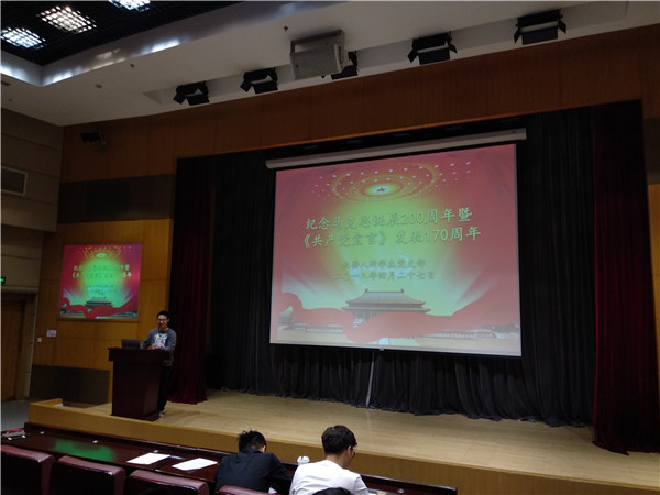 隨后,全體師生共同觀看了紀(jì)錄片《卡爾·馬克思的一生》。片中記錄了馬克思的生平,講述馬克思與燕妮的婚姻、與恩格斯的一拍即合、被驅(qū)逐的一段落魄生活。在當(dāng)時(shí)那么殘酷的社會現(xiàn)實(shí)之下,馬克思仍然初心不改,滿腔熱情地投入到實(shí)踐和創(chuàng)作中,給觀看的師生留下了深刻的印象,同學(xué)們看完之后對于《共產(chǎn)黨宣言》和《資本論》的時(shí)代背景,以及馬克思的生平有了更加深入的了解。郭莉談到,通過重溫馬克思的一生和學(xué)習(xí)《共產(chǎn)黨宣言》,激勵(lì)大家不忘初心、牢記使命,她希望黨員同學(xué)能夠經(jīng)常研讀經(jīng)典,并從中汲取精神動力。會議最后還進(jìn)行了春季安全教育。